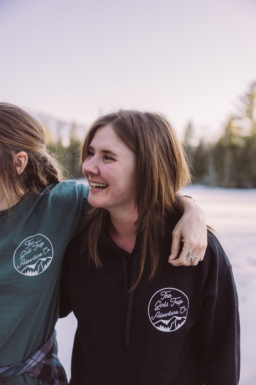 Gildan Softstyle hoodie with The Girls Trip Adventure Co. round logo on ground and backpack label on back.