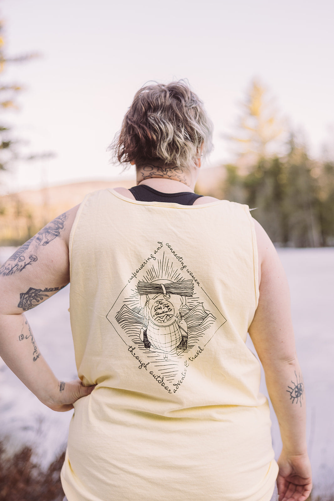 Comfort Colors® tank top with The Girls Trip Adventure Co. round logo on front and backpack logo on back.